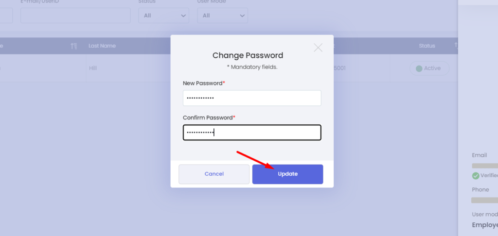 To reset the user password, click on the Change Password button on the User Details sidebar, you can provide a new password in the popup window and Update.