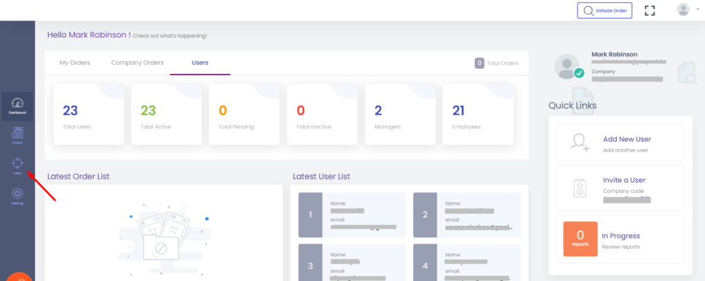 To go to the Users page from the Dashboard page, you can click on Users on the left sidebar menu. Please refer screenshot below.