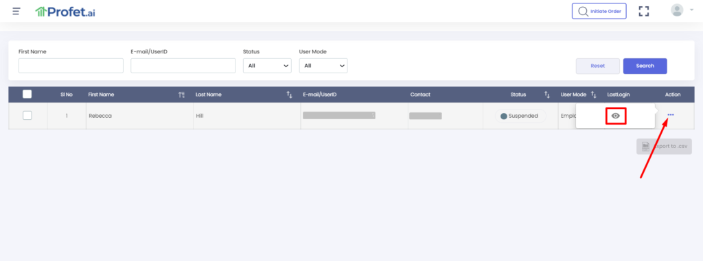 On the Users page, you can search for the required user by First Name or their E-mail/UserID. Once the user is identified, go on the menu option (⋯) against Actions and click on the eye icon. Refer screenshot below.