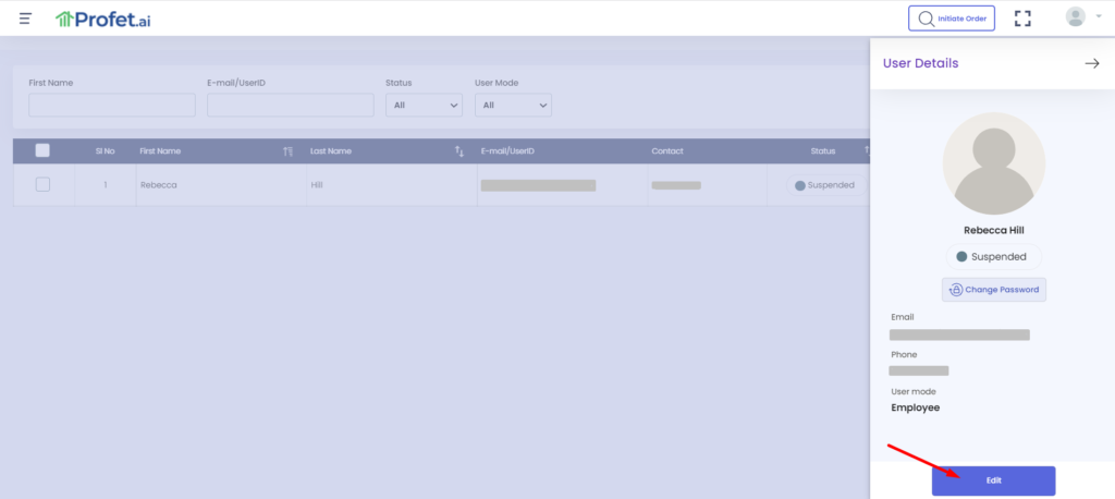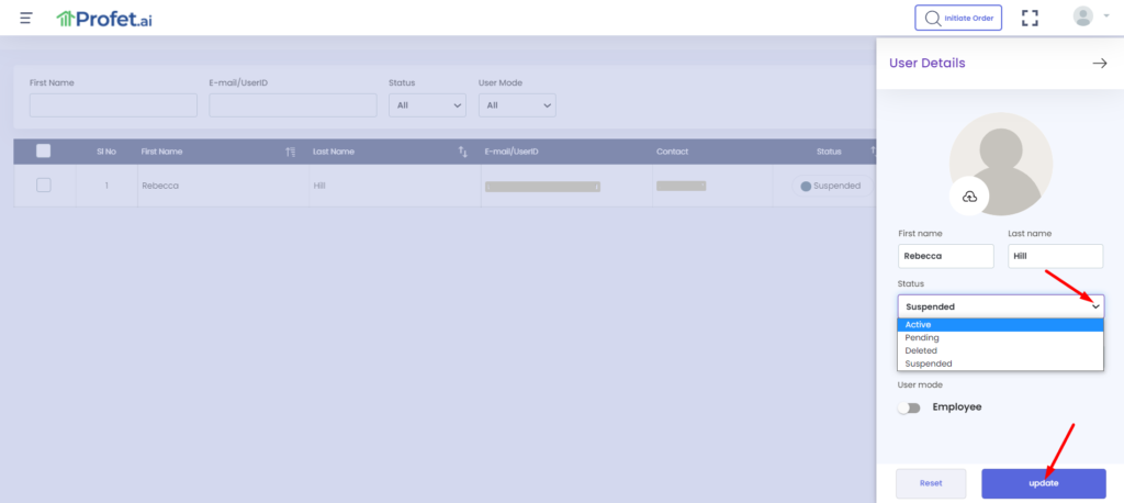 Here you will have the options to change the Status of the user from Suspended to Active. The status can also be changed to Pending or Deleted. Please see what each of these statuses in Profet.ai denote: