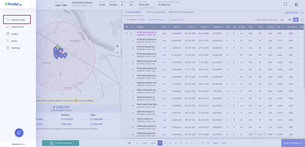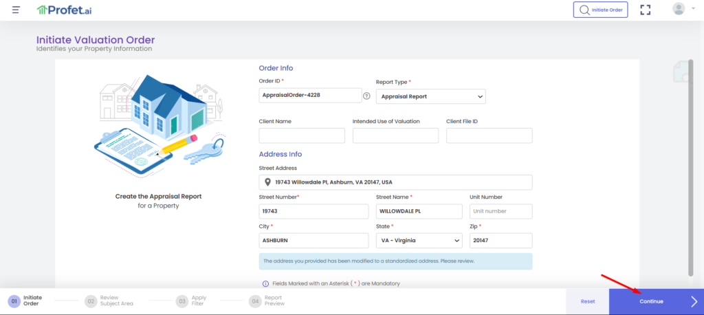 Once logged in to Profet, initiate an order as usual by entering the subject property address and other details and click on Continue.