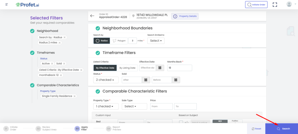 Choose your comp search filters after reviewing the Subject property details.