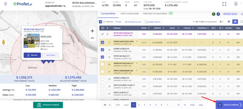 Select the required Comparables (a minimum of 3 comparables must be selected) and click on Save & Continue to go to the value adjustments page.