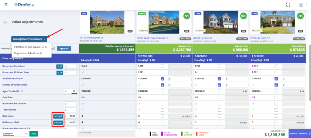 Once you have chosen the comparable properties for your subject and click “Save and Continue” Profet will automatically present the value adjustments page. You can make value adjustments for the selected comps and move to the Report Preview step.