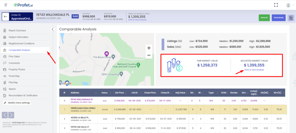 Review the report sections on the Report Preview page, Comparable Analysis section shows the fair market value and the adjusted fair market value. Click on the “Click to view analysis” button to go back to the value adjustments page and review the value adjustments.
