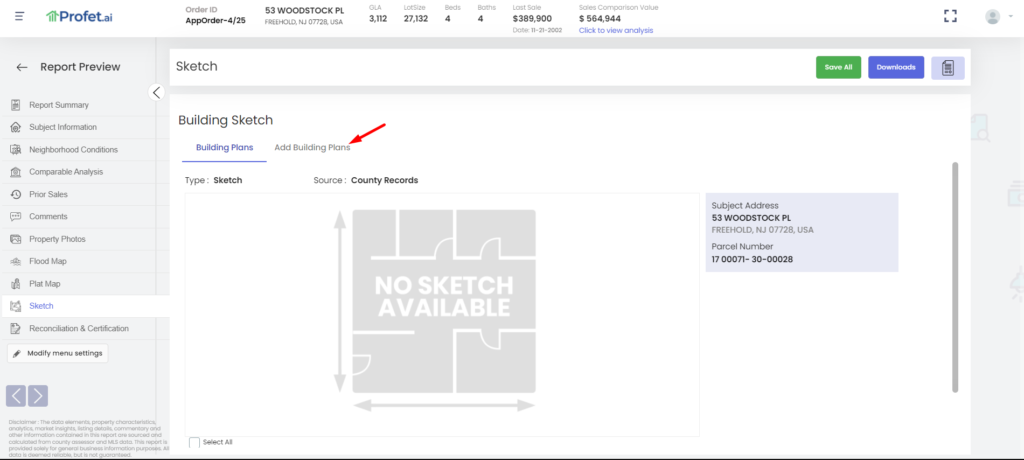 On the Report Preview page, go to the Sketch tab, the building sketch will be displayed here under the Building Plans tab if we already have a sketch for the subject property. If not, you can upload your own by going to the Add Building Plans.