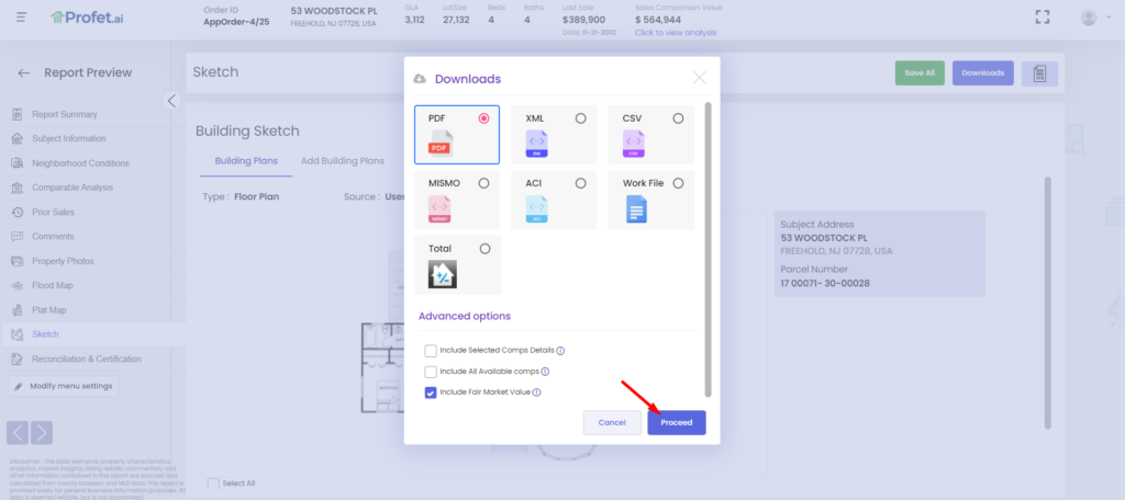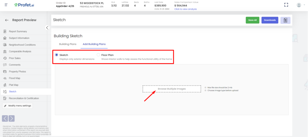 Here are the steps to upload the sketches into any Appraisal Report. The feature is also available for all report types provided by Profet.ai.