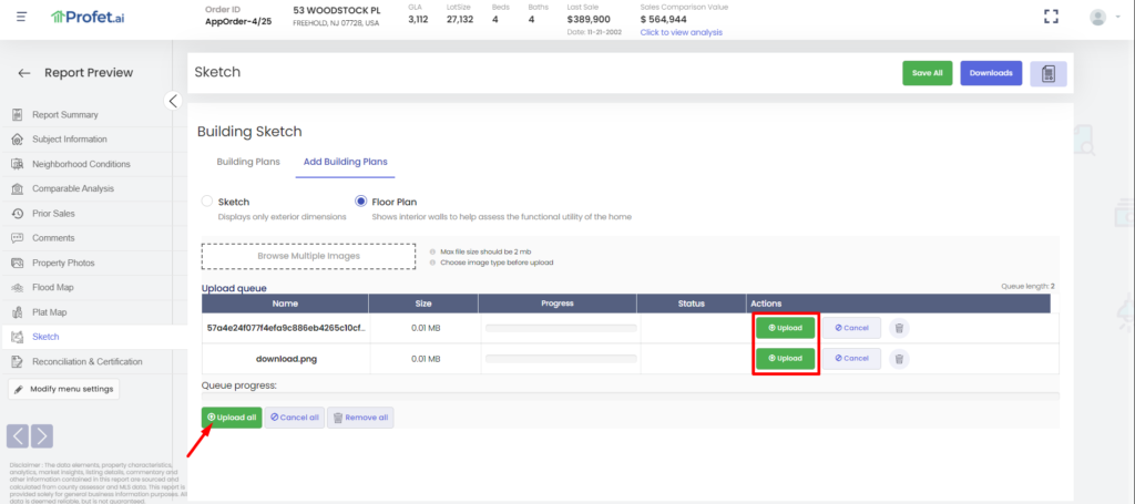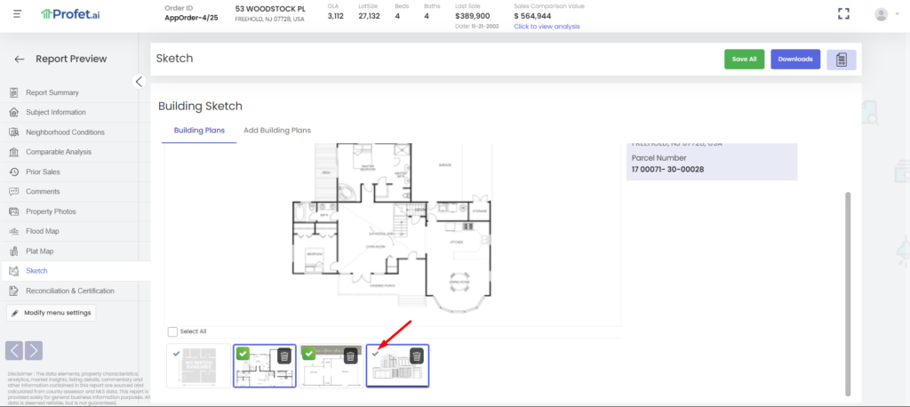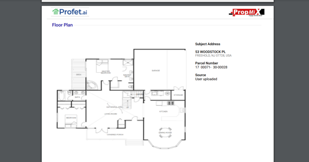 While Profet tries to automatically get you the building sketch from the county website and any other floor plans available from the listing, very often, the latest sketches and floor plans might not be readily available. Keeping this need in mind, Profet allows the user to upload any building plans (sketches or floor plans) into the appraisal reports.