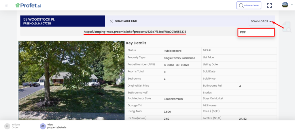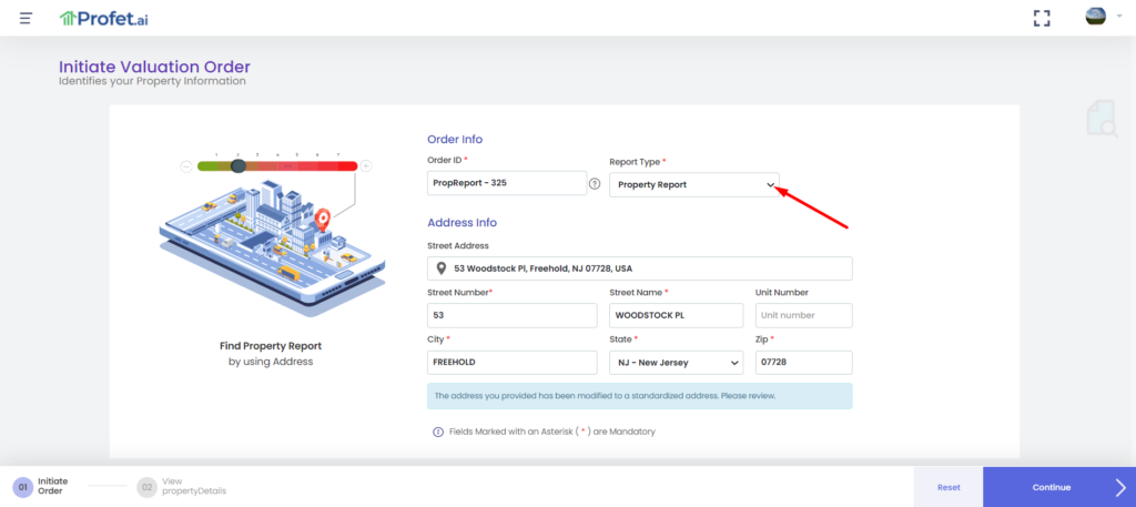 Once you are logged into Profet, you can initiate an order as usual by clicking the “Initiate Order” button. Then enter the Order ID and Subject property address, select the report type as Property Report and click Continue.
