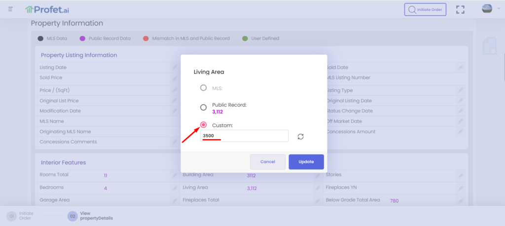 Each attribute is editable by you and if edited it will be displayed in green. Click on the pencil icon against the attribute to edit the value. You have the option to choose between public record data and MLS provided data, or you can provide a custom value. Once done, you can save it by clicking “Update”.