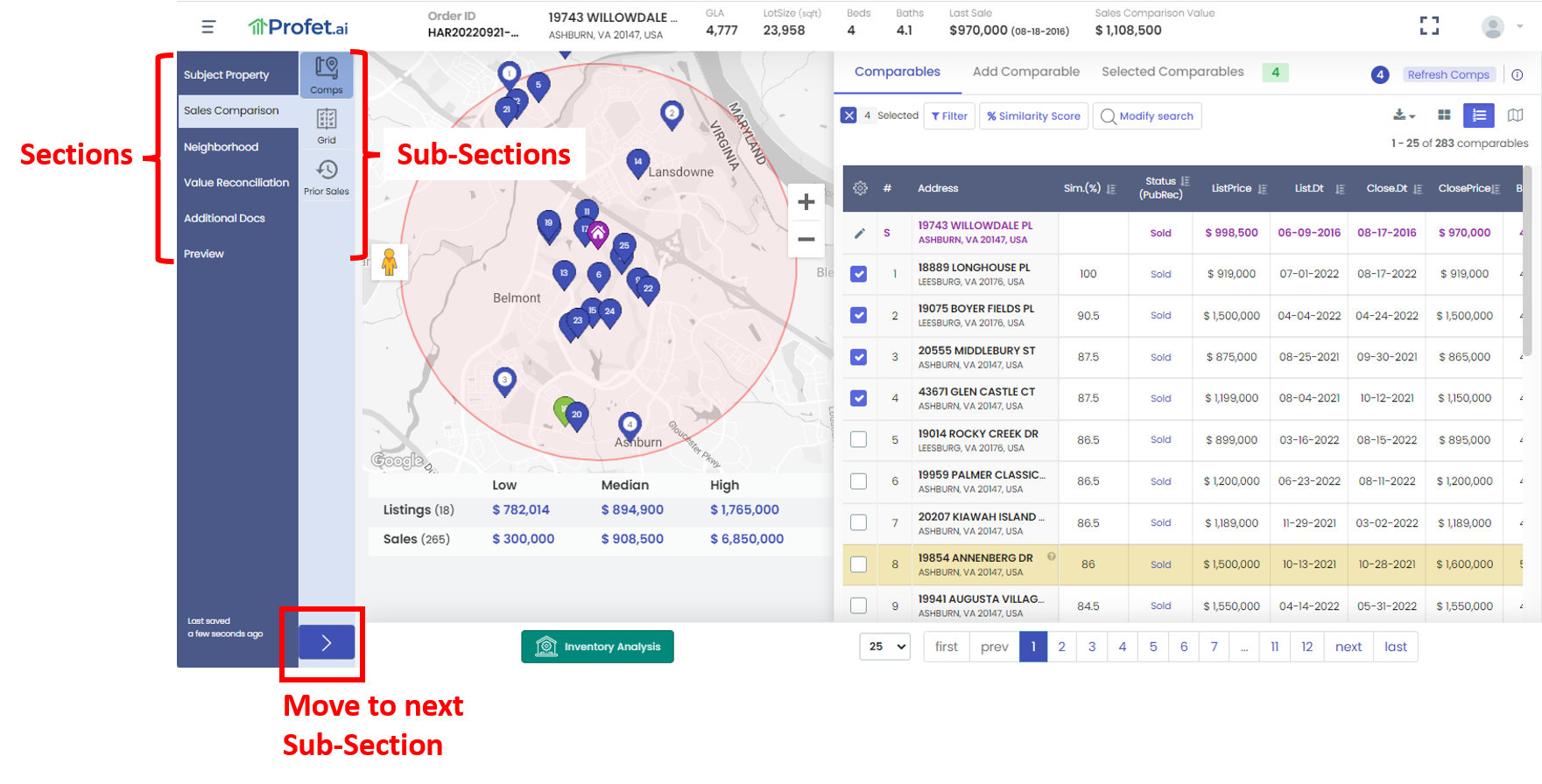 - Grid – after selecting a minimum of 3 comps, the user will perform their Value Adjustments using Profet’s embedded Regression model or the user’s own model that could be implemented. Adjustments can be made at the field level, as well as by using additional included custom features. Value Adjustments details can be found Here.